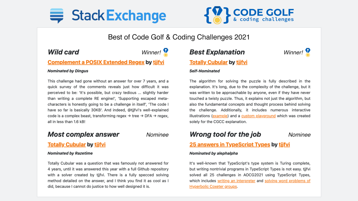 I fully accomplished the mission, successfully answering all 25 questions using TypeScript types. My set of answers was nominated for Best of CGCC 2021.