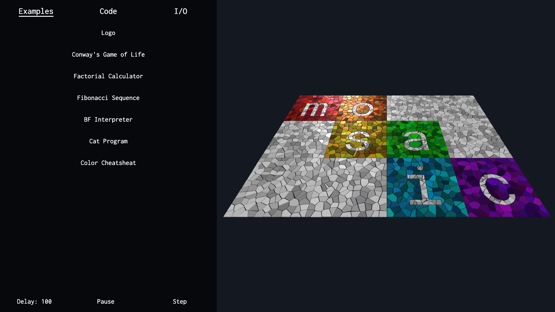 the Rust interpreter via WASM, and displays the progression of the mosaic in 3D